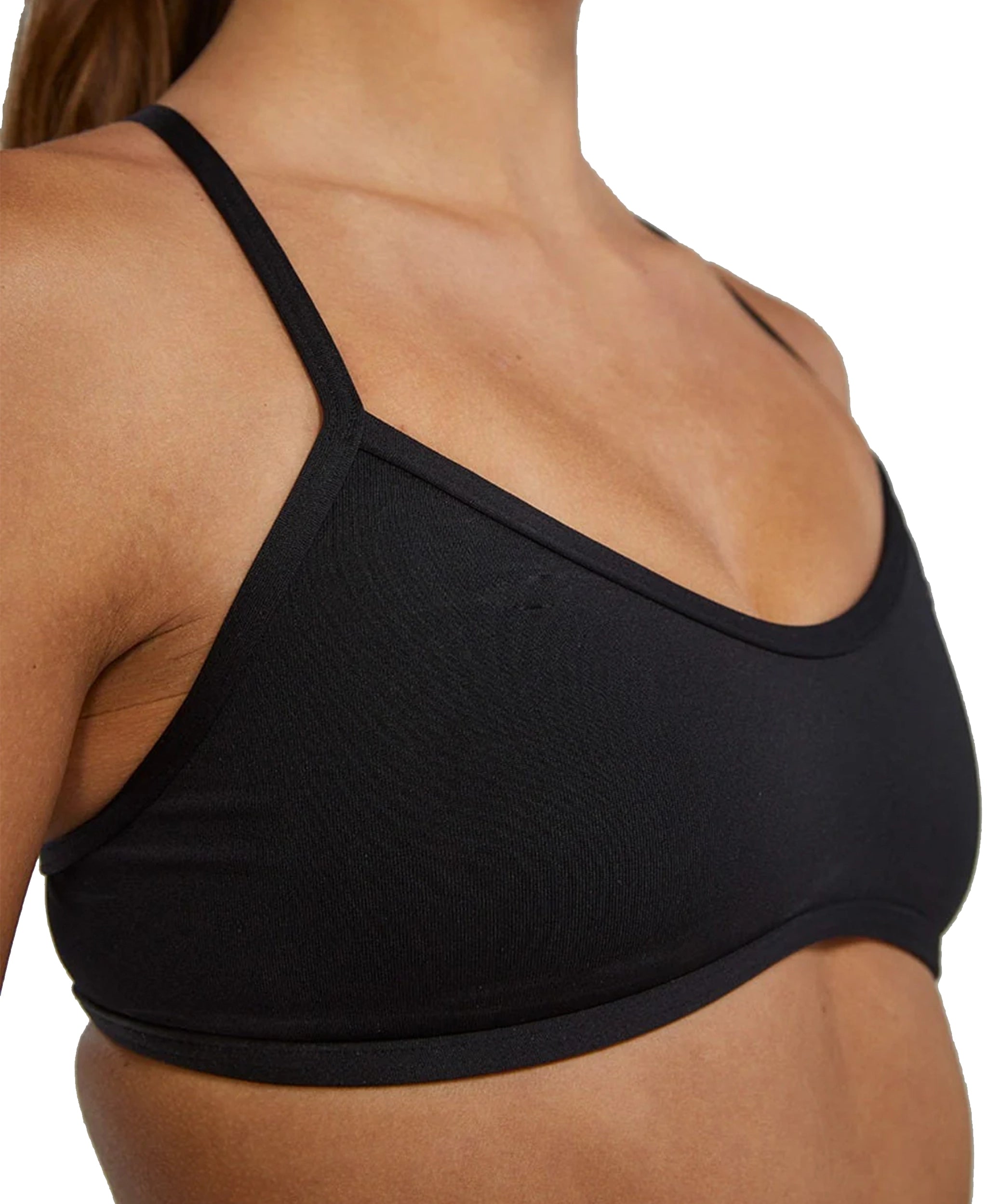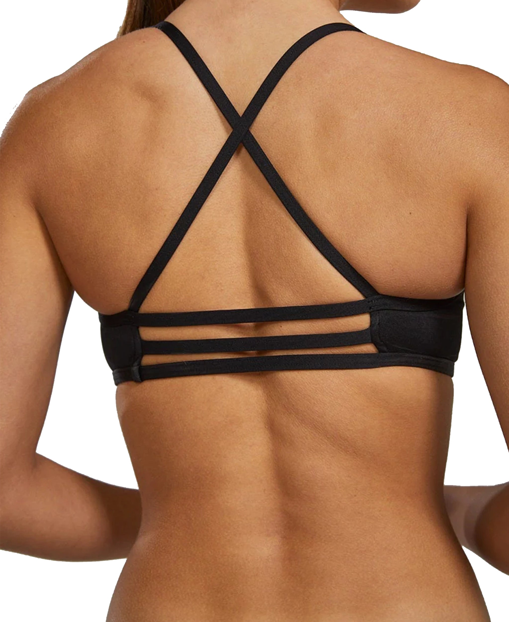 Decote baixo, costas abertas com tripla fixação, alças flexíveis
